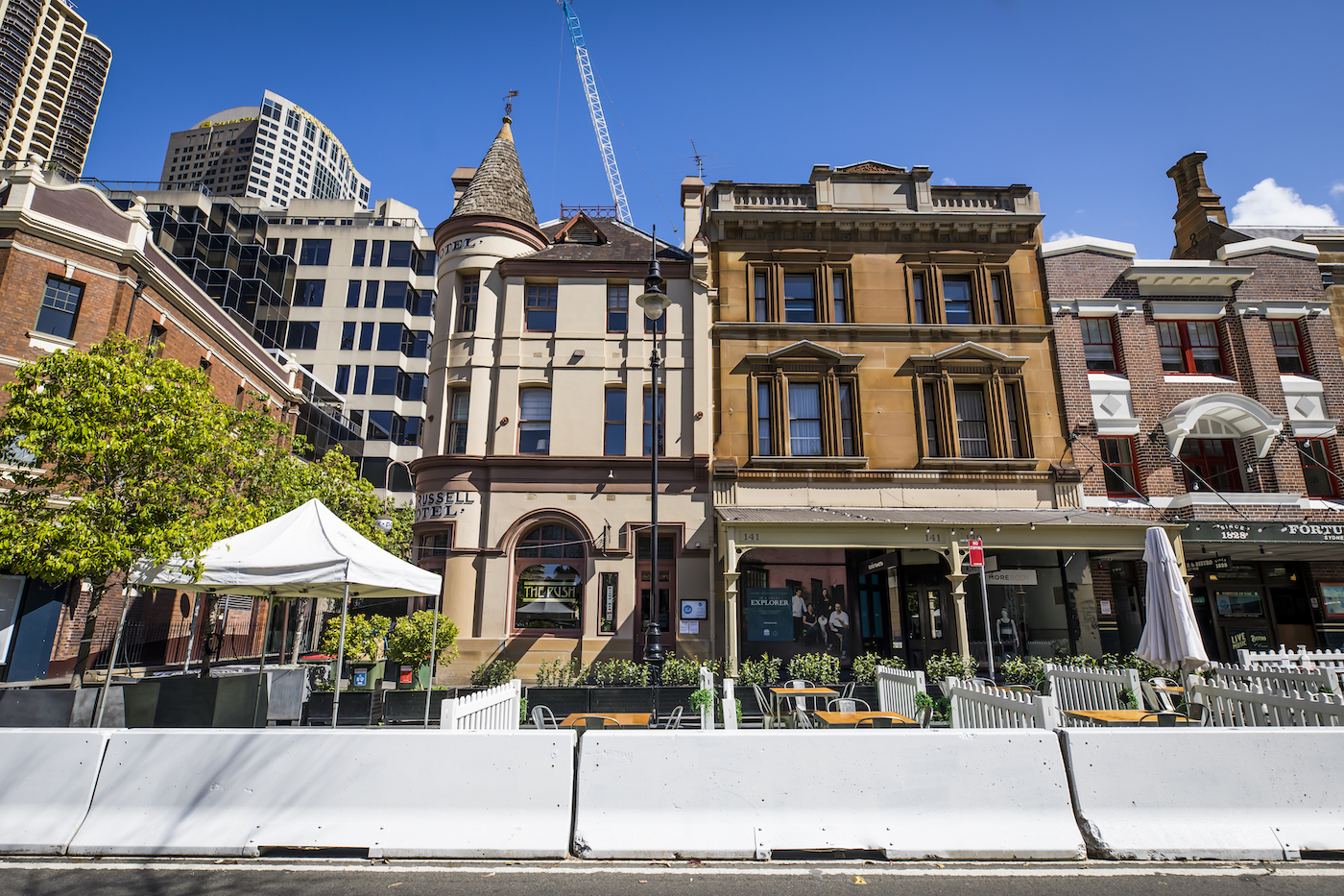 The George Street elevation of 139 -141 George Street demonstrates the design characteristics of an 1880s Classical Revival style commercial building façade. The Classical Revival style sandstone façade of 139-141 George Street is now one of only a few remaining in Sydney, although this type of façade was once much more common. The building is a large three-storey building of dressed sandstone built the early 1880s. The upper floor windows have fine detailing in the carved stone surrounds, and the whole building is topped by a high parapet with a large central pediment.