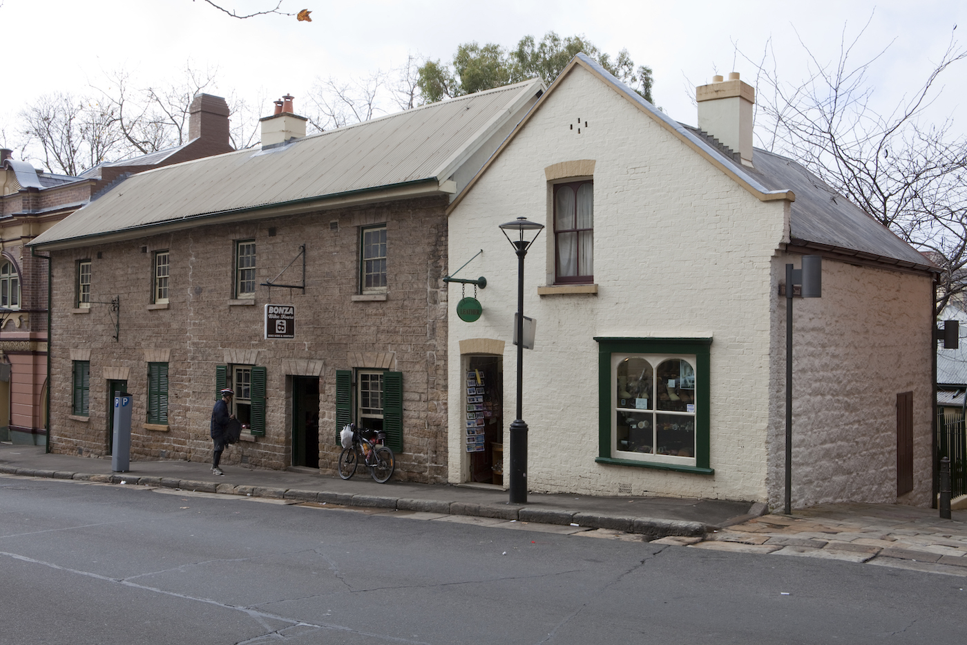 This pair of stone buildings is among the earliest surviving houses in Sydney, built between 1829 and 1830. They occupy a block of land between George, Argyle, and Harrington Streets and Suez Canal that formerly was associated with the site of the 1788 Assistant Surgeon's residence, later occupied by the first colonial architect, Francis Greenway. 28-30 Harrington Street was built by convict blacksmith William Reynolds and is an example of early 19th century housing built and inhabited by pardoned convicts who remained in NSW and practised trades or professions. Reynolds was a friend and neighbour of fellow ex-convict Michael Gannon, and the two were responsible for many houses in the vicinity. The property remained in the family's possession until the latter 19th century, and the rear courtyard gained a notorious reputation by the 1850s.